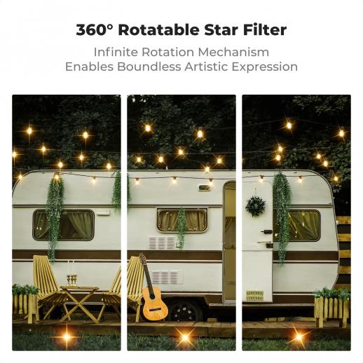 - * 【Telaio girevole a 360° per angoli flessibili】Il robusto telaio del filtro ruota fluidamente, consentendo di regolare liberamente l'angolazione delle esplosioni di stelle di 360 gradi. Questo ti offre il controllo creativo completo per allineare perfettamente l'effetto alla tua composizione.