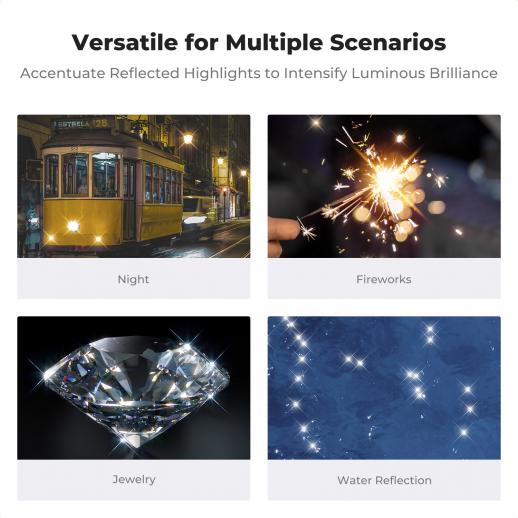- * 【Crea effetti stellari vibranti e delicati】Questo filtro a stella produce eleganti effetti stellari a 4 punte da sorgenti luminose puntiformi, aggiungendo istantaneamente un tocco di dinamismo e lusso ai tuoi scatti. Rispetto ai filtri ad effetto forte, le linee più sottili forniscono un accento scintillante senza sopraffare il soggetto principale, perfetto per creare un'atmosfera vivace.