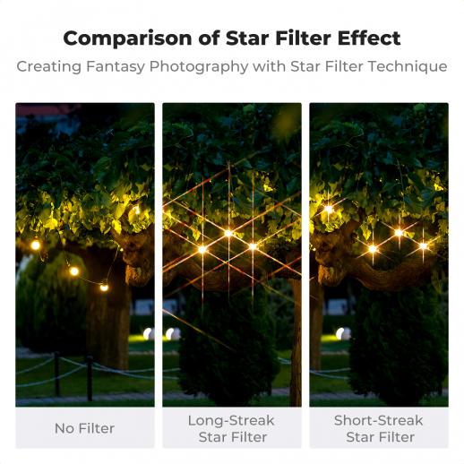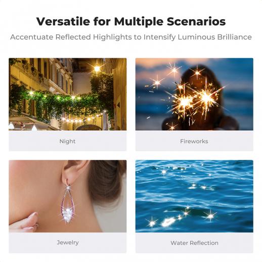 - * 【Crea effetti stellari vibranti e delicati】Questo filtro a stella produce eleganti effetti stellari a 4 punte da sorgenti luminose puntiformi, aggiungendo istantaneamente un tocco di dinamismo e lusso ai tuoi scatti. Rispetto ai filtri ad effetto forte, le linee più sottili forniscono un accento scintillante senza sopraffare il soggetto principale, perfetto per creare un'atmosfera vivace.