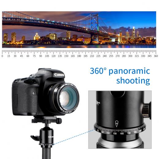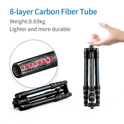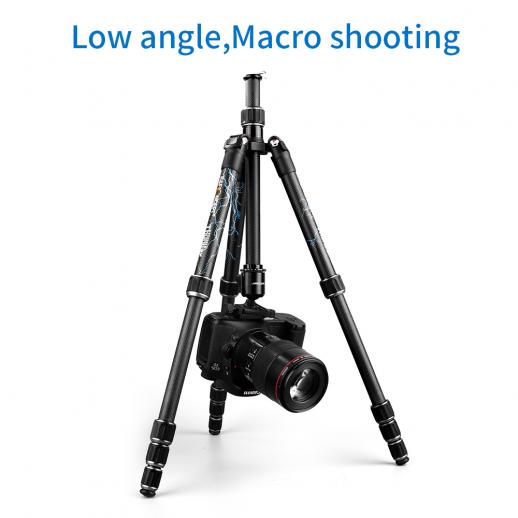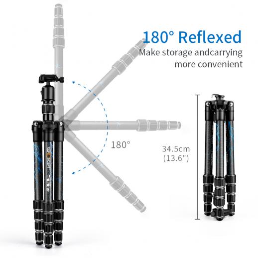 - * Tubo treppiede in fibra di carbonio di qualità, può essere piegato a rovescio di 180 gradi in senso inverso e installare invertito, l'altezza piegata è di soli 13.6 "(345mm) il peso del treppiede della fotocamera è di 1,85 libbre, più piccolo in modo da aiutarti a viaggiare comodamente.