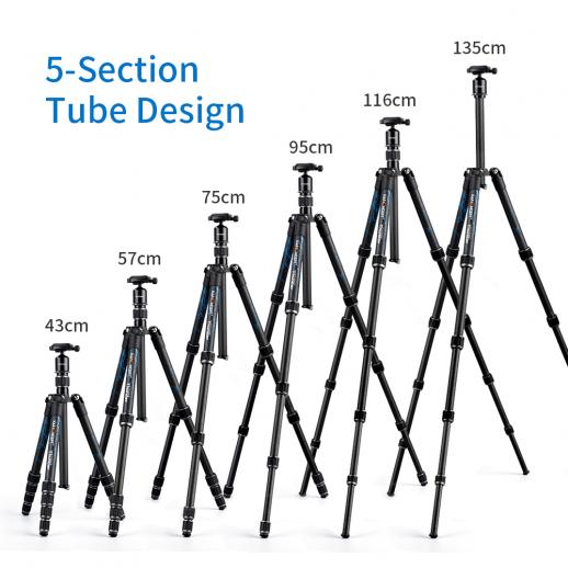 - * Specifiche treppiedi: 23 mm, gambe in fibra di carbonio a 5 sezioni. Altezza piegata: 13,6 "Altezza estesa: 53,1". Peso netto: 1,85 sterline.