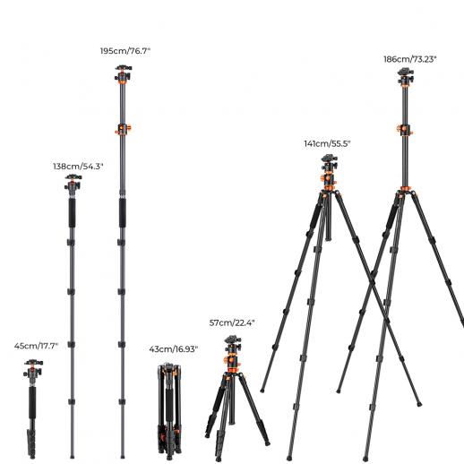 K&F Concept 185cm Treppiede Video Professionale in Alluminio con Colonna Centrale + Monopiede + Testa a Sfera + Piastra di Sgancio, Carico Massimo 10 kg - T254A3+BH-28L (S211)