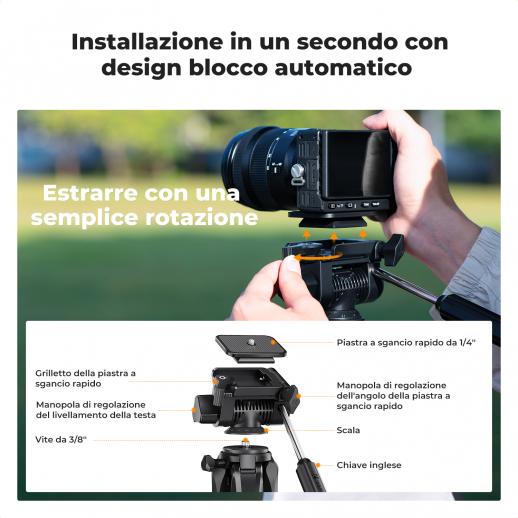- * [Struttura triangolare composta]rende il treppiede più stabile quando si scatta all'aperto. La testa del treppiede può caricare fino a 4 kg, supporta una rotazione orizzontale di 360°, angolo di inclinazione +100°/-70° regolabile, la piastra a sgancio rapido può essere scattata orizzontalmente, per soddisfare le esigenze di riprese multi-angolo.