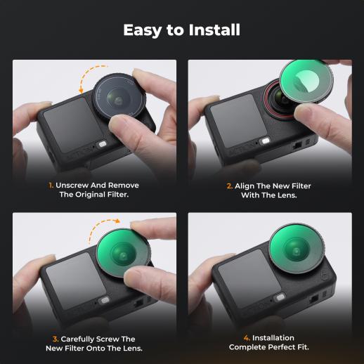 - * 【Compatibilità perfetta con DJI Osmo Action 6】 Progettati specificamente per le fotocamere Action 6, questi filtri garantiscono una vestibilità perfetta e prestazioni impeccabili. Funzionano perfettamente con la maggior parte delle custodie e degli accessori senza bisogno di rimuoverli.