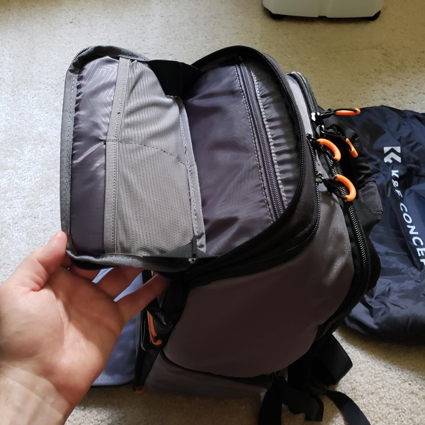 Questo zaino fotografico K&F Concept trasmette immediatamente l'impressione di essere un attrezzo robusto e durevole. I materiali e la costruzione suggeriscono che possa effettivamente fornire un affidabile strato di protezione per la preziosa attrezzatura fotografica durante il trasporto. Aprendo lo scomparto principale, l'ampio spazio interno diventa evidente. Può ospitare comodamente una notevole quantità di attrezzatura, gestendo facilmente configurazioni come due reflex digitali full-frame insieme a una selezione di obiettivi, o in alternativa, due corpi macchina mirrorless e una versatile gamma di obiettivi, oltre ad accessori aggiuntivi come batterie e filtri. La sezione superiore della borsa offre una soluzione pratica per riporre una fotocamera mirrorless con un obiettivo montato, rendendola rapidamente accessibile quando necessario. L'aggiunta di un punto di accesso laterale offre un altro modo pratico per recuperare l'attrezzatura senza dover aprire completamente lo scomparto principale. Inoltre, il design della borsa incorpora sapientemente cinghie per fissare un treppiede, completando le sue capacità per il trasporto di un set fotografico completo, incluso un laptop. Considerando la struttura apparentemente robusta, le opzioni di archiviazione ben studiate e la possibilità di trasportare numerosi accessori, tra cui un treppiede, questo zaino per fotocamera sembra essere un'offerta valida a un prezzo apparentemente ragionevole.