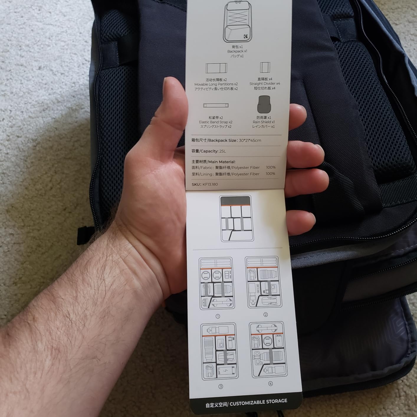 È stato molto gentile da parte loro includere uno schema che mostra alcune diverse configurazioni. A volte faccio fatica a visualizzare come dovrebbero essere posizionati gli inserti. Questo aiuta sicuramente in questo! Ho lo zaino da 25 litri e sono soddisfatto delle dimensioni e del peso complessivi. Può contenere la maggior parte (se non tutti) degli oggetti di cui potreste aver bisogno per un'uscita di successo. C'è persino uno spazio per hard disk, schede SD e laptop.