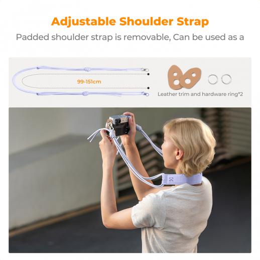 La tracolla inclusa in realtà funge anche da tracolla per la macchina fotografica abbinata, e viene fornita con gli attacchi necessari per ottenere ciò.