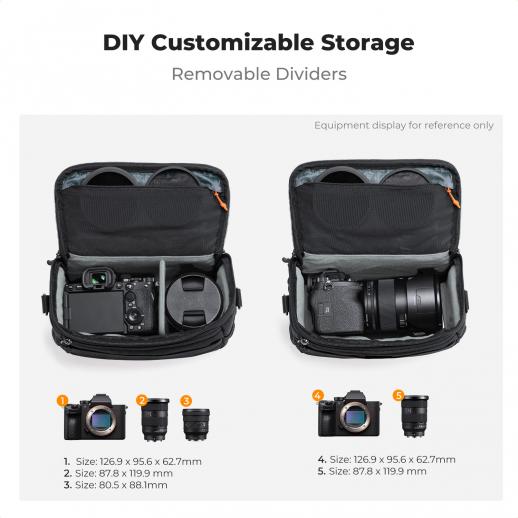 - * 【Compagno di viaggio compatto e leggero】 Progettato per la fotografia di strada e i viaggi, questa borsa a tracolla leggera (764 g) può contenere comodamente 1 corpo macchina fotografica DSLR/Mirrorless e 2 obiettivi. Perfetta per i fotografi che necessitano di una borsa fotografica compatta in movimento. Dimensioni esterne: 9,6"x5,5"x7,2".
