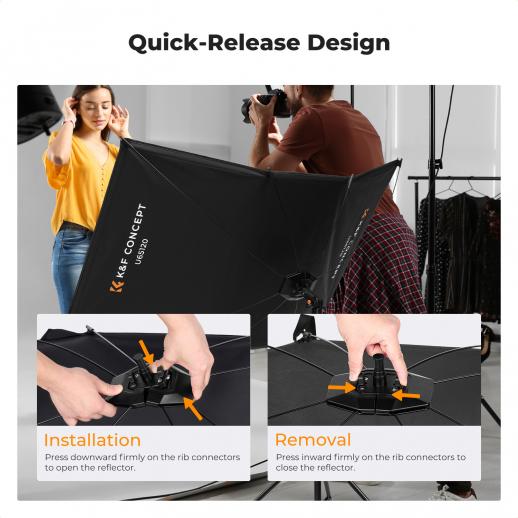 Riflettore a U ad apertura rapida K&F CONCEPT, 120x65 cm, con tessuto riflettente 4 in 1, disponibile nei colori nero, oro, bianco e argento, include un supporto da 1,5 m e una borsa per il trasporto. Adatto per l'uso in studio fotografico.