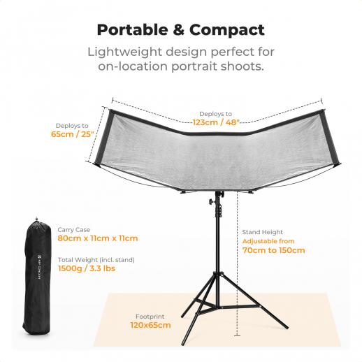 - * 【Leggero e portatile】Con dimensioni da aperto di 123x65 cm, questo prodotto ha dimensioni moderate, occupa poco spazio ed è ideale per ambienti ristretti. Il riflettore pesa solo 690 g e l'intero set, incluso il supporto per la luce, pesa solo 1500 g. Leggero e portatile, viene fornito con una borsa per il trasporto, il che lo rende ideale per la fotografia di ritratto all'aperto. La semplicità di montaggio e smontaggio consente di risparmiare tempo durante gli scatti all'aperto.