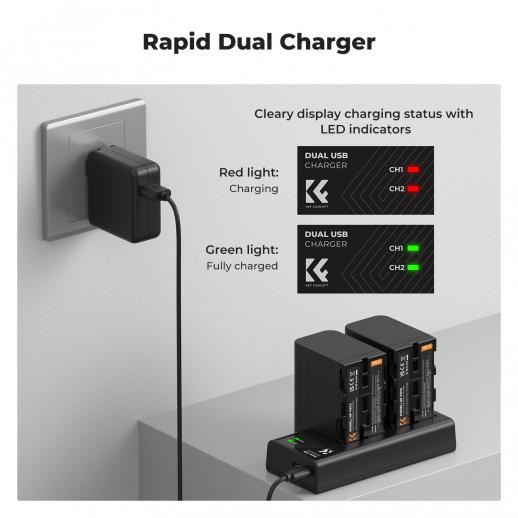 K&F Concept NP-F970 (2 pezzi) batterie da 6600mAh e kit di caricabatterie LED compatibile con Sony NP-F550 F570 F750 F770 F930 F950 F960 F970 per luci LED ad alta potenza/Monitor/Camera Slider