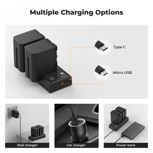 Si tratta di una confezione da due batterie ricaricabili (LiIon) compatibili con Sony NP-F970. Include anche un caricabatterie a 2 canali alimentato tramite USB.