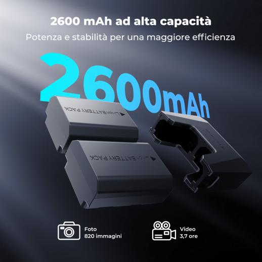 - * 【Batteria ad alta capacità】Le due batterie LP-E6NH hanno una capacità effettiva di 2600 mAh, superiore alla capacità della batteria originale, per migliorare la durata del dispositivo.