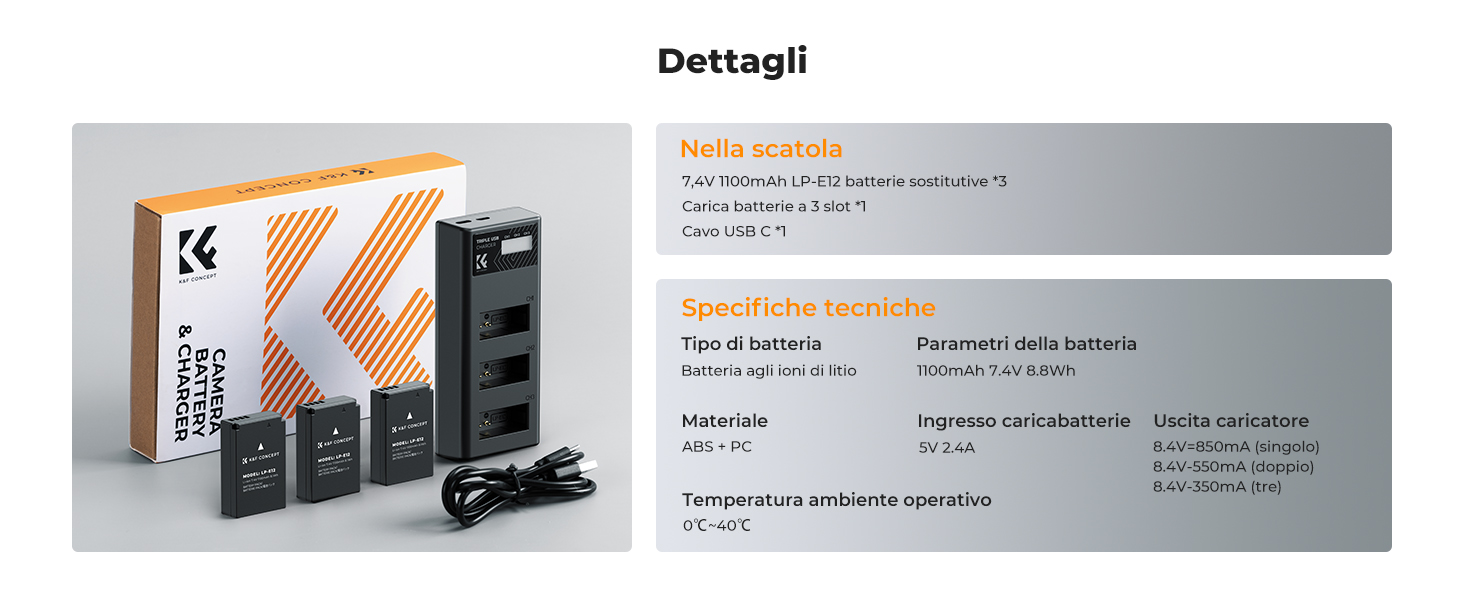 Il set di batterie LP-E12 di K&F è eccellente. Le tre batterie possono essere ricaricate in modo sicuro nel caricabatterie. Non ci sono interruzioni e il piccolo display LED facilita la visualizzazione del livello di carica.