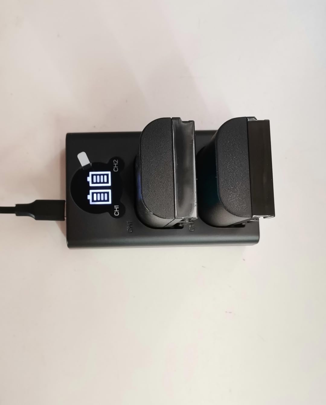 Per quanto riguarda il funzionamento, il caricabatterie è molto facile da usare. Permette di caricare due batterie contemporaneamente, visualizzando il livello di carica di ciascuna con una barra sul display. Grazie alla porta USB-C, può essere facilmente alimentato da una batteria esterna o anche da un caricabatterie per auto. Le batterie si caricano molto più velocemente rispetto al caricabatterie originale Canon, riducendo notevolmente i tempi di attesa.