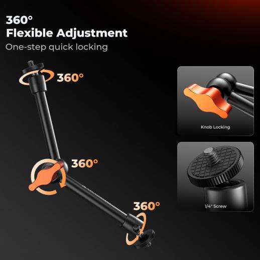 - * [BRACCIO MAGICO REGOLABILE A 360°] - Supporto per fotocamera Magic Arm con design a doppia testa a sfera a 360° per una maggiore flessibilità, regola facilmente il dispositivo nella posizione ideale. Entrambe le estremità del braccio magico sono dotate di viti da 1/4" per il fissaggio di fotocamera, flash, microfono, webcam, monitor e action cam.