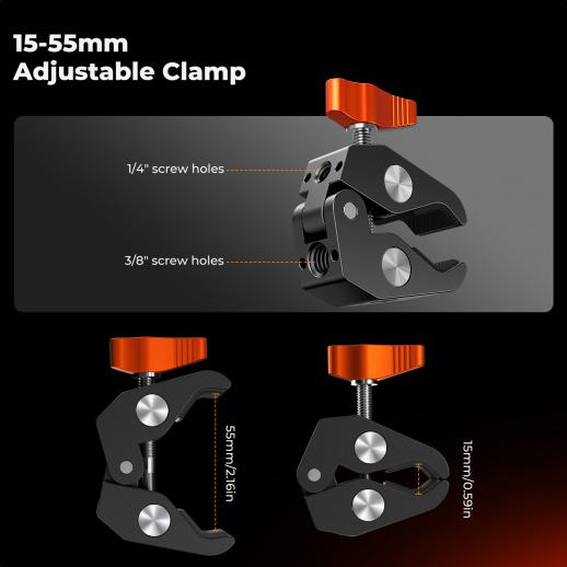 - * [SUPER CLAMP ROBUSTO] - Il braccio magico Super Clamp può essere montato su pali, pali, treppiedi, tavoli, scrivanie, manubri di biciclette/moto e fissato a gabbie, monitor, luci, flash, action cam tramite fori di posizionamento da 1/4" e 3/8". Può aprirsi fino a un massimo di 55 mm e fino a un minimo di 15 mm.