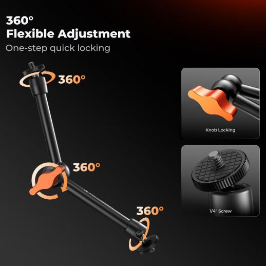 - * [FACILE DA REGOLARE] - Tutti i giunti del braccio magico con super morsetto possono essere allentati o serrati contemporaneamente con le viti a testa zigrinata. Allentando le viti a testa zigrinata, la testa sferica è libera di ruotare di 360° e il braccio può essere posizionato a diverse angolazioni. Stringendo la vite a testa zigrinata si bloccano in posizione il giunto sferico e il braccio articolato.