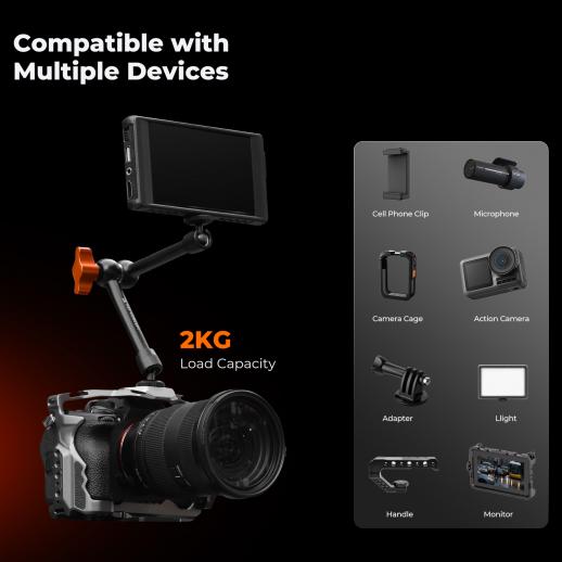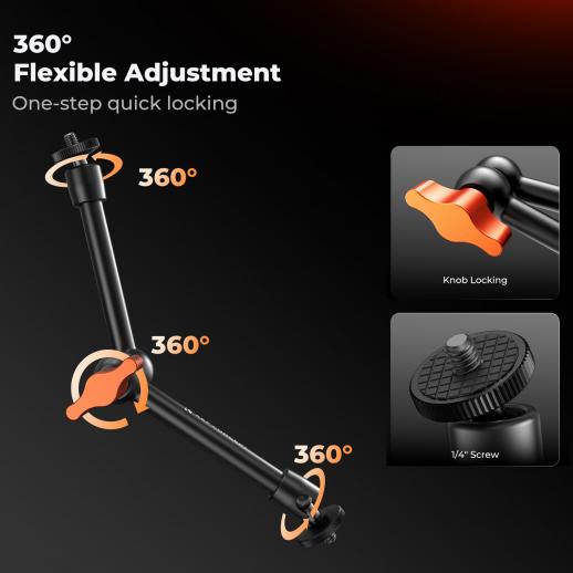 - * 【Braccio magico regolabile a 360°】- Dotato di un design a doppia testa sferica, il supporto per telecamera con braccio magico offre una flessibilità superiore per posizionare senza sforzo l'attrezzatura all'angolazione desiderata.