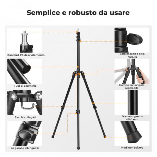 - * 【Stabile e ad alta capacità di carico】Realizzato in resistente lega di alluminio, supporta fino a 5 kg. Dispone di un gancio per sacchi di sabbia per migliorare la stabilità e di una distanza regolabile per le gambe per un supporto migliore.