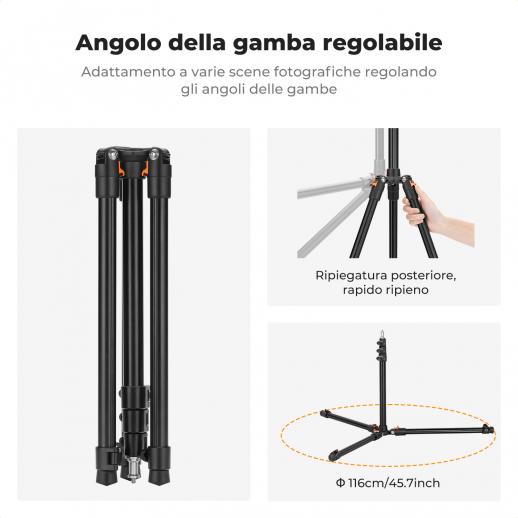 - * 【Altezza regolabile】Con il palo centrale a 4 stadi e le gambe a 2 stadi, il supporto si regola da 53 cm a 2 m, ideale per riprese dal basso o dall'alto.
