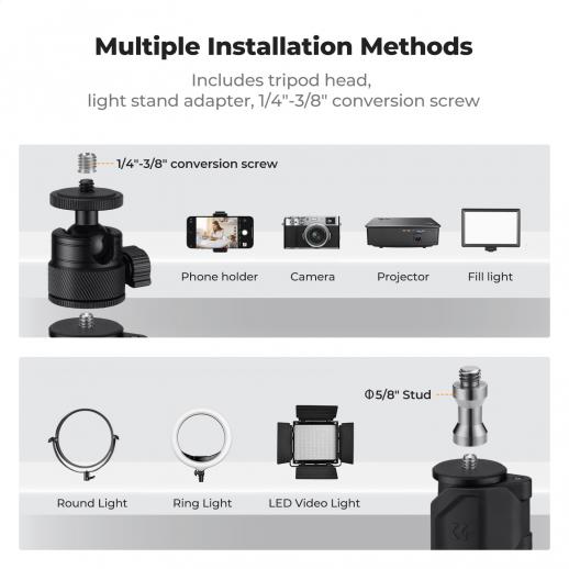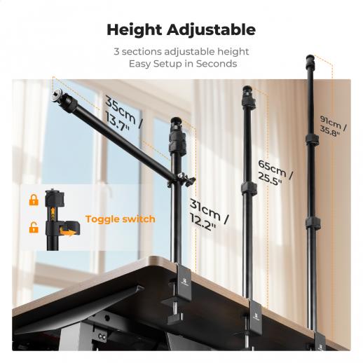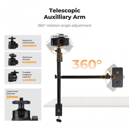 - * 【Braccio per riprese dall'alto】Ottieni la visuale perfetta dall'alto. Il braccio estensibile da 35 cm posiziona la fotocamera o il telefono direttamente sopra la scrivania per scatti impeccabili dall'alto. Con una capacità di carico di 1 kg e una testa girevole a 360°, è ideale per riprese da diverse angolazioni e configurazioni di illuminazione.