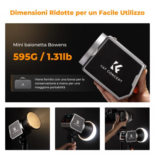 K&F Concept PL-60B 60W COB luce fotografica con batteria integrata da 4500 mAh, supporta la ricarica rapida Type-C PD, 12 effetti luce, luce video per riprese in movimento con maniglia e borsa portaoggetti