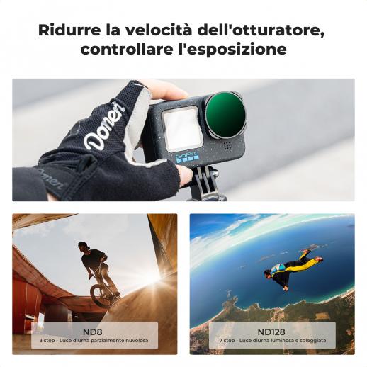 - * Controllo flessibile dell'esposizione: i filtri ND riducono la velocità dell'otturatore per creare un effetto mosso durante le attività dinamiche all'aperto, che può conferire all'immagine un forte senso di velocità e impatto. ND2-32 (1-5 stop) per condizioni di luce media e ND64-512 (6-9 stop) per condizioni di luce intensa. Questi filtri VND sono adatti per time-lapse per ottenere cascate setose e scie luminose per aggiungere un tocco artistico.