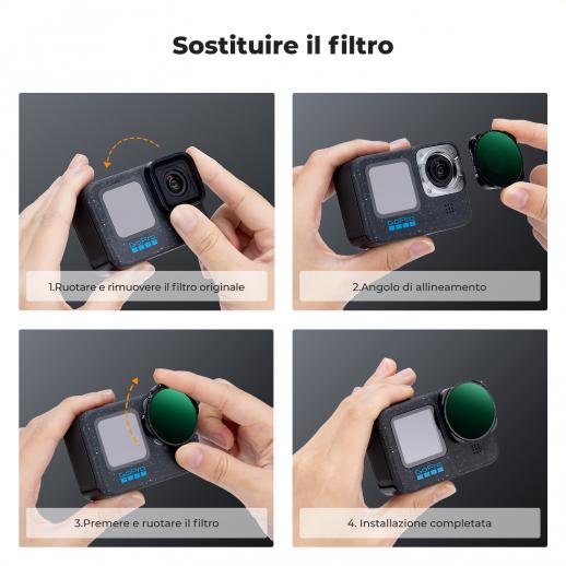 - * Facile da usare: ruotare e svitare il filtro originale, quindi allineare l'angolazione e ruotare bloccando il filtro dopo aver agganciato la fibbia. Questo kit di filtri aiuta a ottenere immagini e video cristallini in modo efficiente durante la corsa, l'arrampicata, il ciclismo, il paracadutismo, ecc.
