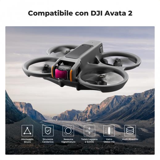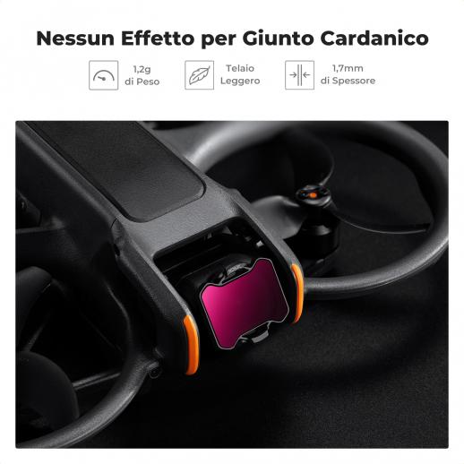 Set completo di filtri ND Avata 2, a un prezzo ragionevole. Questi filtri si inseriscono a scatto e sono sicuri. - Buona qualità, struttura in metallo e leggerezza. - Il vetro è cristallino e nitido attraverso la fotocamera. - L'adattamento è perfettamente aderente, non allentato. Un po' complicato da rimuovere? - Consente la completa articolazione del gimbal, non si inceppa, ecc. - La copertura del gimbal può essere utilizzata dopo l'uso senza dover rimuovere il filtro. Questo set è più che adeguato per coprire la maggior parte degli ambienti con illuminazione artificiale. Personalmente, uso il filtro UV come predefinito per una maggiore protezione dell'obiettivo.
