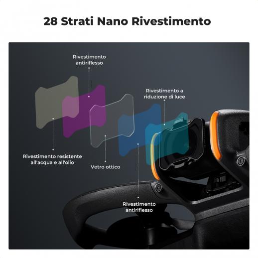 - * 【Vetro ottico con 28 rivestimenti multistrato】Ogni filtro, realizzato in vetro ottico AGC importato, senza compromettere la qualità dell'immagine, garantisce il ripristino del colore reale. Il doppio lato del vetro è dotato di un rivestimento multistrato, che aiuta a respingere acqua, polvere, grasso e graffi. Facile da pulire e manutenere, protegge l'obiettivo Avata 2 da ogni tipo di sollecitazione.