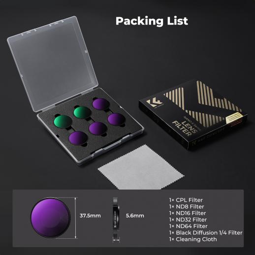 K&F Concept Kit da 6 Filtri HD Compatibile con DJI Osmo Action 6, CPL ND8 ND16 ND32 ND64 Black Diffusion 1/4 - Filtro Polarizzatore Effetto Riduzione Luce in Vetro HD Nano Multistrato