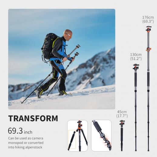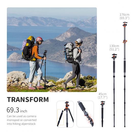 Questo treppiede può essere staccato per essere un monopiede e convertito in un bastone da montagna quando si rimuove una gamba; Può essere utilizzato in diverse occasioni; adatto per riprese con inclinazione dall'alto e riprese dal basso