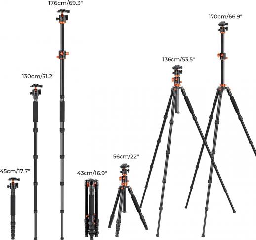 K&F Concept 170cm Treppiede in Alluminio per Fotocamera Reflex con Colonna Centrale + Monopiede + Testa a Sfera da 28mm + Piastra a Sgancio Rapido, Carico Massimo 10kg - T255A4+BH-28L (TM2515T1)