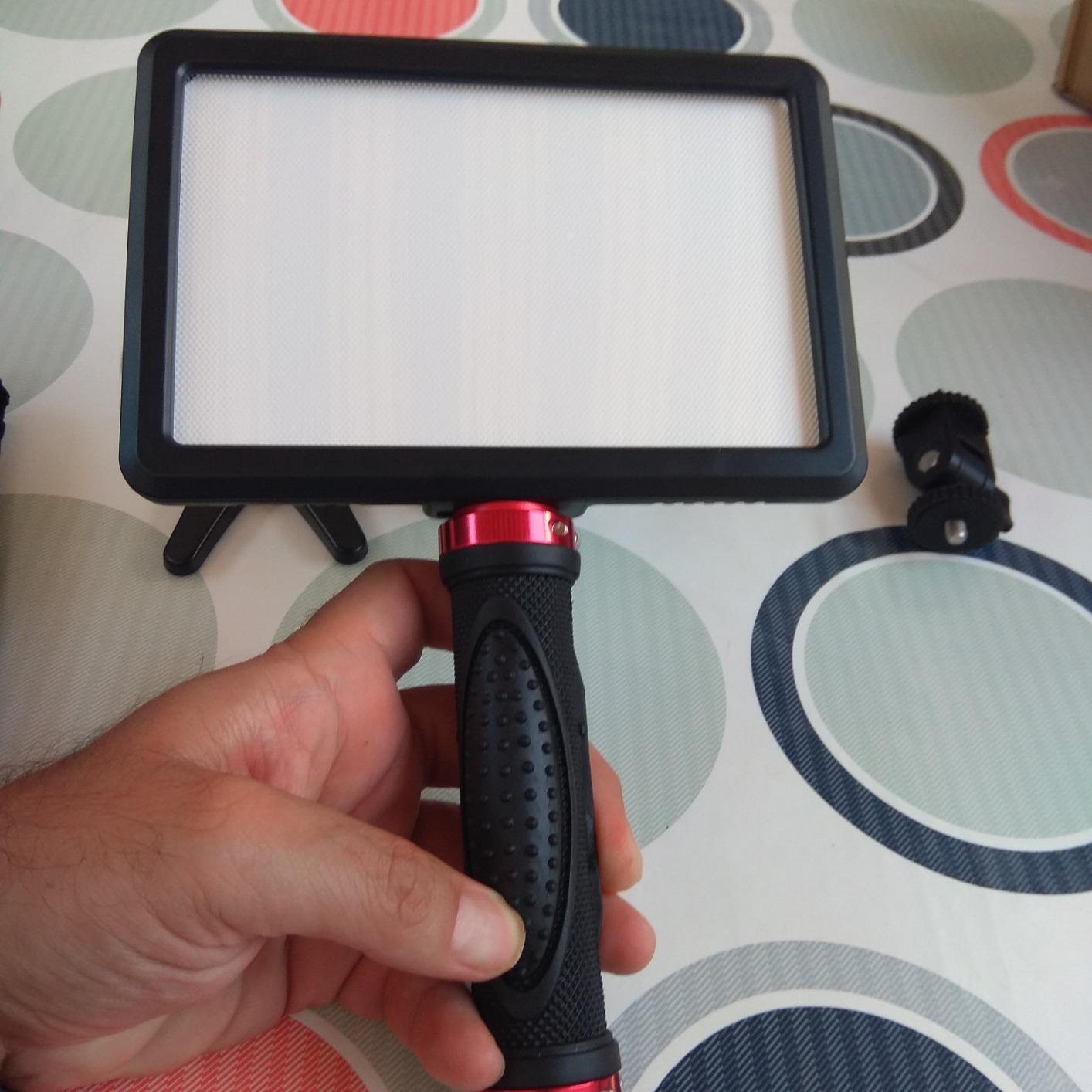 Una luce piuttosto potente, anche se è possibile configurarla sia in intensità (luce) che in temperatura (luce fredda, neutra o calda). Viene fornita con batteria e caricabatterie, ma la spina non è compatibile con le prese spagnole, è necessario utilizzare un adattatore. Viene fornita con una custodia, un'impugnatura per la fotocamera e un'altra impugnatura.