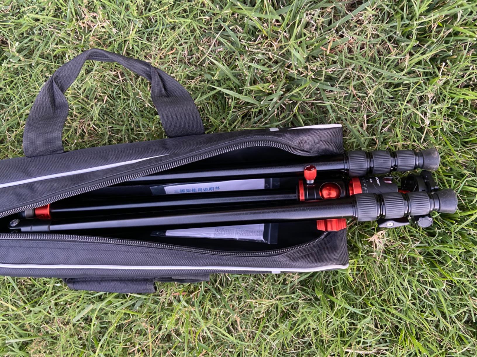 Viene fornito con borsa per il trasporto, nella confezione viene anche fornita una testa a sfera che è ben fatta.
