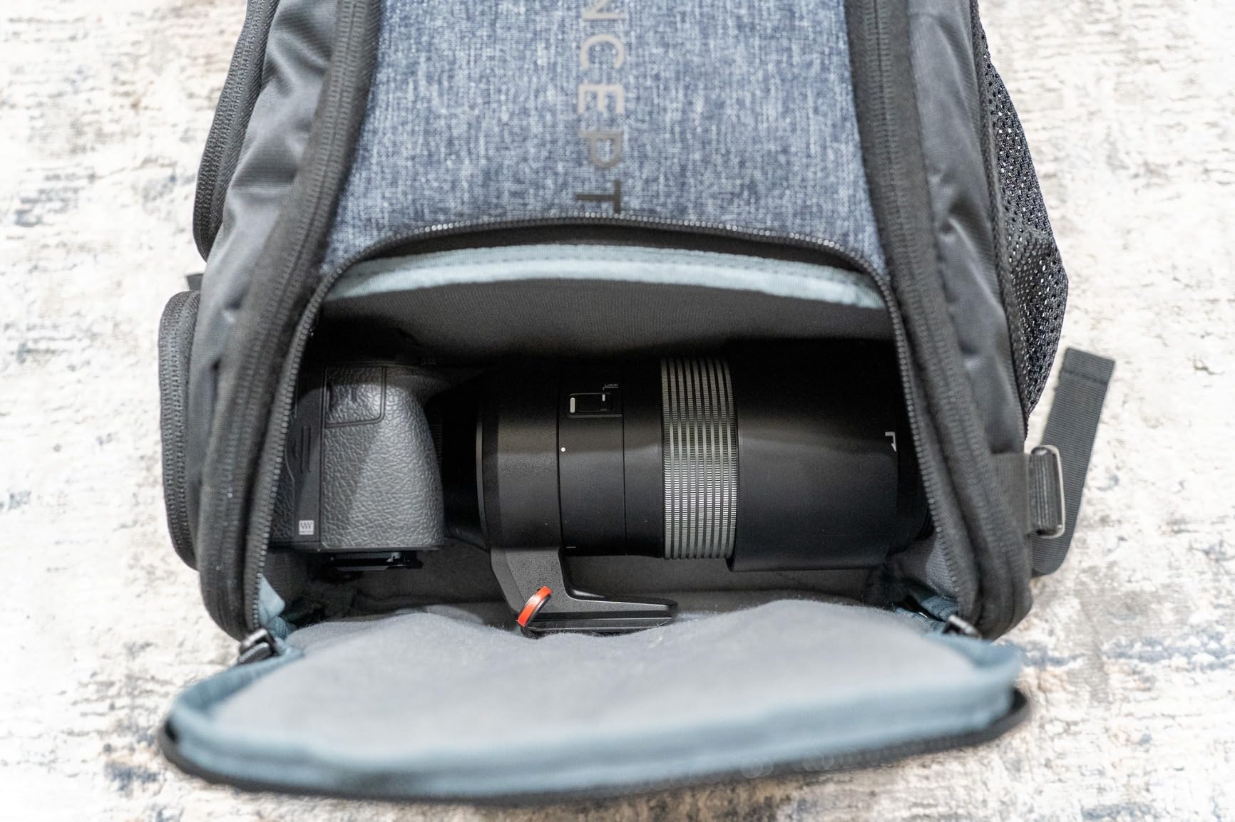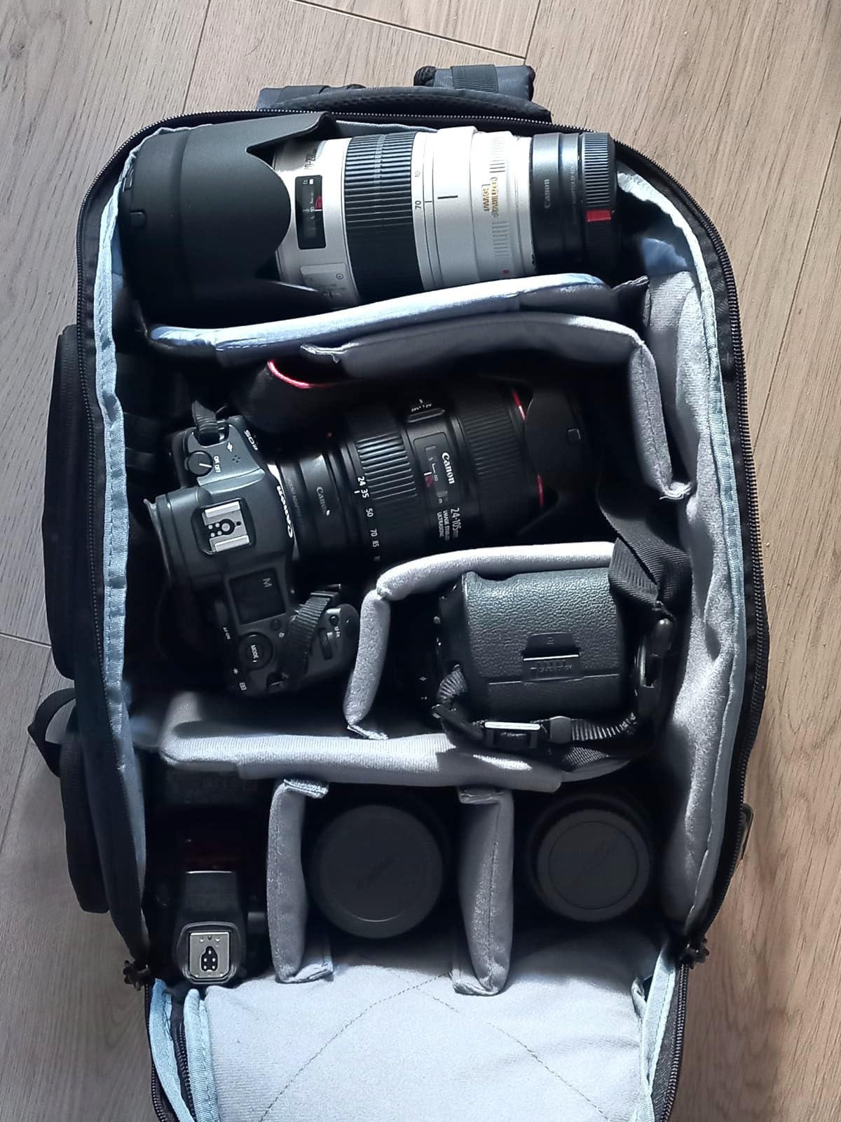 Questa borsa fotografica molto elegante ha una finitura curata e, per alcuni modelli, è dotata di divisori rimovibili. La disposizione di questi divisori richiede un'attenta valutazione delle esigenze che avremo a seconda dell'attrezzatura da portare. Se cambiamo regolarmente il tipo di attrezzatura da portare, la suddivisione diventerà più complessa. Due lunghi divisori sono cuciti e solo ripiegabili. Personalmente ho cercato di posizionare al meglio le partizioni per portare con me durante questa prova un corpo 24x36 con impugnatura e obiettivo 24-105, un obiettivo 70-200/2.8, uno zoom grandangolare, un flash Cobra, un corpo reflex aggiuntivo, un moltiplicatore di focale, due batterie, schede di memoria, un filtro ND e un computer da 15". Ho aggiunto una borraccia nella rete laterale che può essere utilizzata anche come piccolo treppiede. Tutto entra bene nella borsa senza problemi, è molto capiente, ma non c'è più spazio per qualche altro accessorio, le mini tasche integrate sono molto piccole. Avrei voluto aggiungere qualche altro oggetto come altri filtri, un power bank, un quaderno e delle penne, o anche una borsa protettiva impermeabile. Qui la cosa si complica un po' perché mancano alcune tasche grandi e morbide per questi piccoli accessori, ad esempio sul lato esterno grande che alla fine è piuttosto piatto (certamente buono per lo stile e il logo, ma meno per la funzionalità). Per l'accesso laterale e inferiore, funziona molto bene. e consente di evitare di aprire l'intera borsa quando le condizioni non sono ottimali o non è possibile appoggiarla facilmente a terra. Le tasche ben studiate e di piccole dimensioni sono posizionate giudiziosamente su queste alette di apertura.