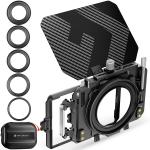 Mini matte box di qualità eccezionale di K&F Concept! È realizzato in metallo e carbonio di alta qualità. Il box permette di utilizzare 2 filtri quadrati contemporaneamente. I filtri sono alloggiati nel telaio metallico, ma possono essere facilmente sostituiti. Il kit include 5 diversi adattatori per obiettivi. Il tutto è confezionato in una custodia rigida. Sono rimasto sorpreso dalla qualità costruttiva di tutti i componenti e dal fatto che questo kit costi il doppio rispetto ad altre marche, ma la qualità è eccellente!