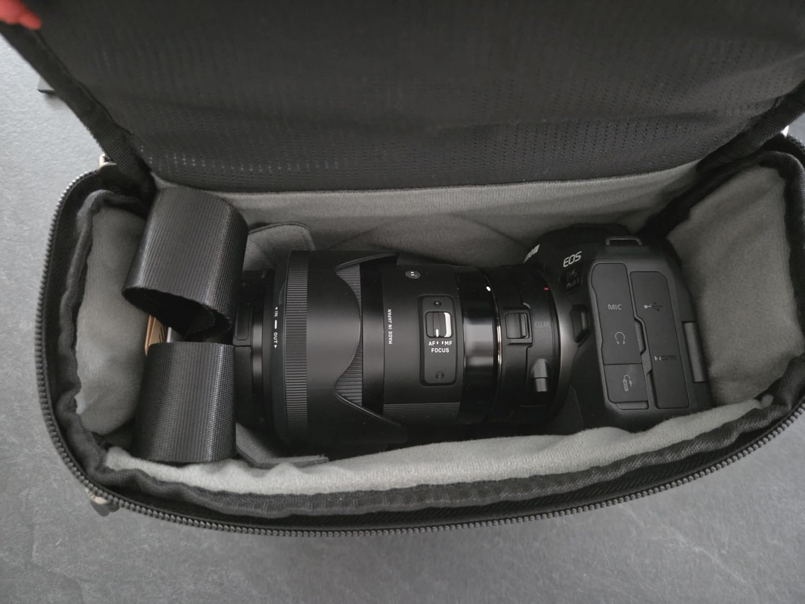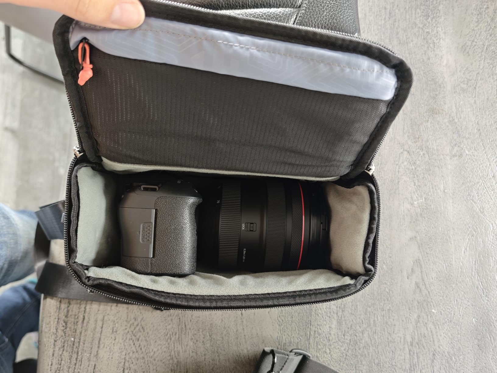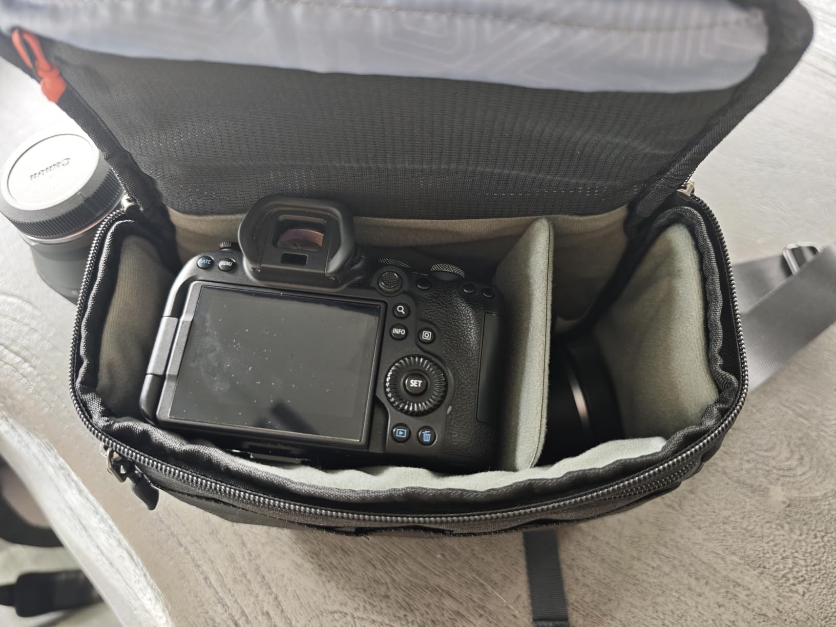 Rispetto alla Lowepro 65AW Toploader e alla borsa a tracolla Grams28, la K&F offre la maggiore capienza. Rimuovendo il paraluce, persino la R6 con il mostruoso 28-70 mm f/2.0 trova posto. Anche un obiettivo 24-105 mm si adatta facilmente, e c'è spazio persino per un piccolo 50 mm. La qualità è impeccabile. Le altre due borse, tuttavia, hanno il vantaggio di una tracolla per un trasporto più confortevole. Ciò che apprezzo particolarmente è la protezione rigida, che offre una maggiore protezione dagli urti e spazio aggiuntivo per batterie, filtri o accessori. L'ampia apertura facilita l'accesso alla fotocamera. Sebbene il design sia gradevole, preferirei che la cerniera si aprisse dall'altro lato, ovvero verso il corpo. Questi sono solo piccoli dettagli che ho notato perché, come fotografo, ho maneggiato parecchie borse. Pertanto, a dire il vero, per 30 euro la borsa è davvero ottima in termini di lavorazione, spazio e imbottitura.