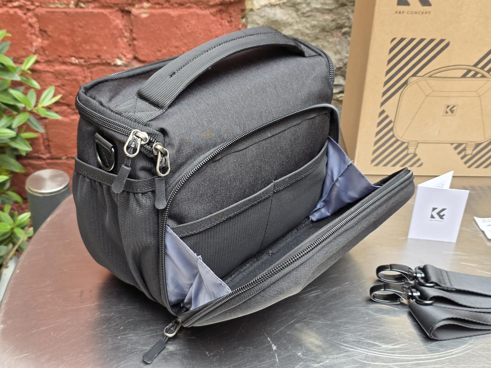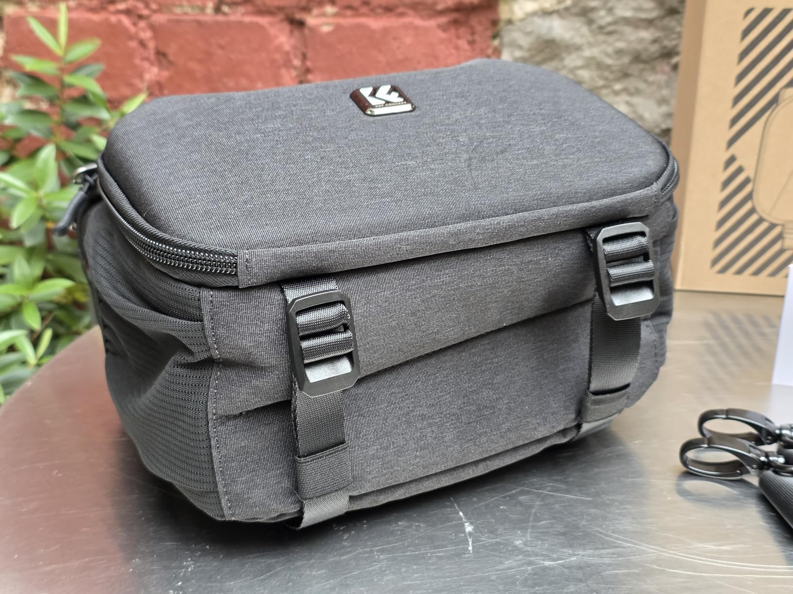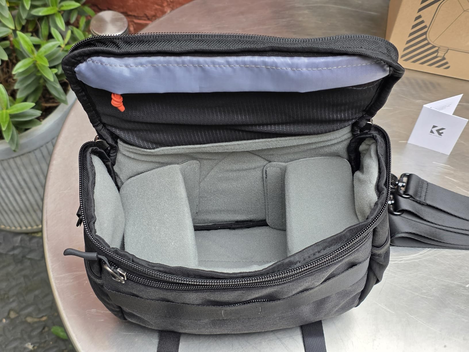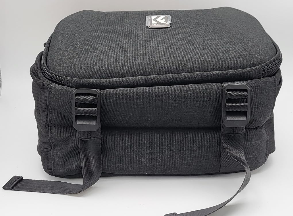 Kf ha realizzato una borsa fotografica piccola ma incredibilmente intelligente e completa. Le finiture sono eccellenti, come sempre con questo marchio con cui sto iniziando a familiarizzare: le cerniere, i manici. Le chiusure sono molto robuste, molto ben rifinite con materiali di alta qualità. Non ci sono problemi di alcun tipo. C'è uno scomparto principale che può essere diviso tramite piccoli divisori in velcro rimovibili. All'interno della patta di questo scomparto, c'è una tasca con cerniera che può contenere cavi e un panno per la pulizia. Sono persino riuscito a infilarci una GoPro. Sul retro della borsa, c'è un'altra tasca con cerniera, ideale per riporre, ad esempio, documenti e documenti importanti. Tenerli a portata di mano riduce il rischio di furto. Su questo pannello posteriore, c'è anche una cinghia perfetta per agganciare la borsa a un bagaglio a mano, ad esempio. Su entrambi i lati della borsa, troverete piccole tasche che possono contenere vari accessori, come un panno per la pulizia o una batteria che dovete prendere velocemente. Sulla parte anteriore della borsa, c'è uno scomparto ben imbottito e ben protetto che funge da scudo, perfetto per riporre un piccolo flash, un piccolo treppiede o altri piccoli accessori. Troverai anche due tasche per schede di memoria o cavi, ad esempio. Puoi persino inserire un selfie stick. Sotto la borsa, ci sono due cinghie per attaccare un treppiede leggero. A prima vista, questa borsa fotografica è minuscola, ma in realtà può contenere molto senza dover portare uno zaino grande, pesante e ingombrante. Davvero fantastico! Grazie k e& F