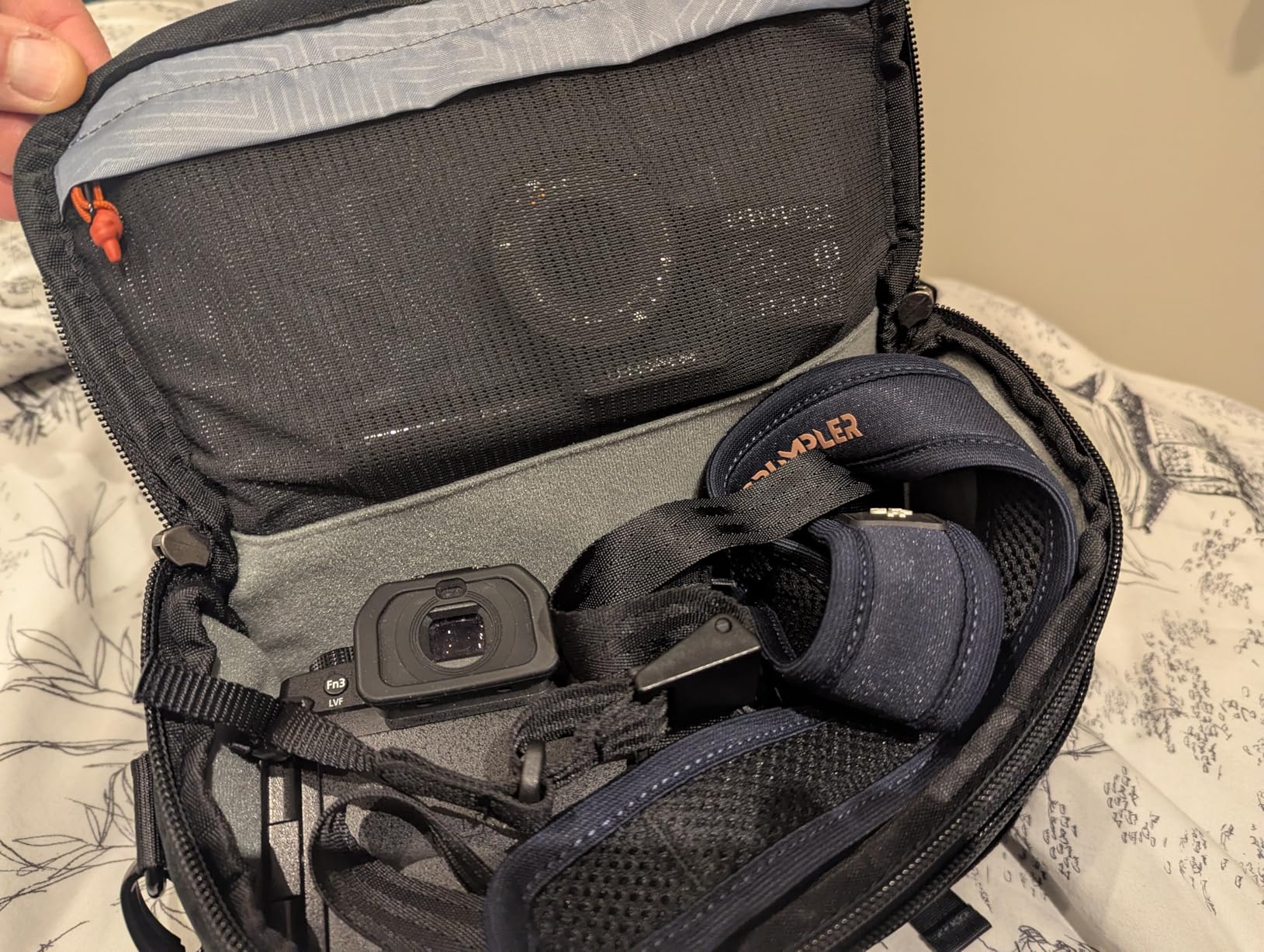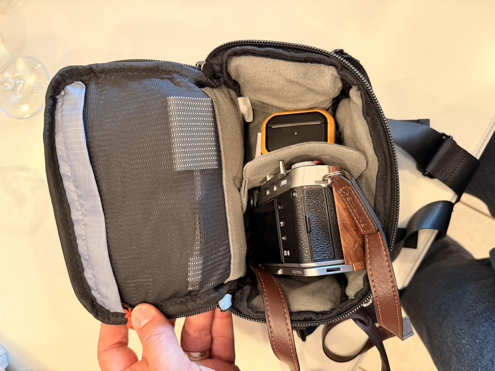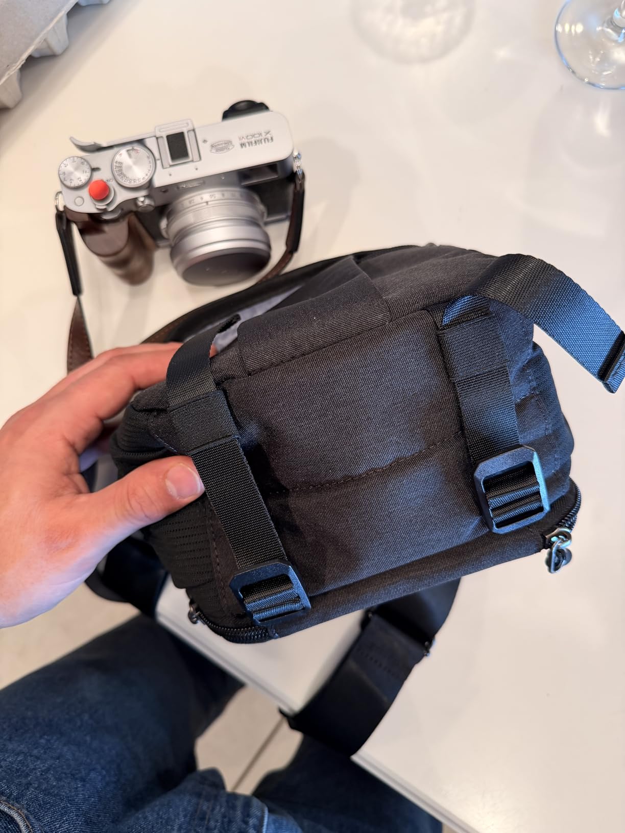 Una fantastica borsa fotografica, perfetta per le fotocamere X100 o qualsiasi compatta. Funziona anche per una mirrorless, soprattutto se si rimuove l'obiettivo. Avevo una borsa più piccola che conteneva a malapena la mia X100VI, ma è così piccola che non si può portare altro. Questa borsa può contenere facilmente la fotocamera, le batterie, gli AirPods, un telefono, un lettore di schede, una scheda di riserva e altro ancora. La tasca anteriore è in materiale rinforzato (rigido) per proteggere qualsiasi cosa ci sia al suo interno. La tasca principale è ben imbottita, quindi mi fido della mia fotocamera. All'interno del coperchio c'è una tasca a rete con cerniera dove tengo il lettore di schede e una scheda di riserva. Poi c'è un'altra tasca con cerniera sul retro che potrebbe essere perfetta per contanti/carte/qualsiasi oggetto piatto. Sotto ci sono delle cinghie regolabili per un treppiede o una giacca. Una borsa fantastica, non molto più grande della fotocamera, ma che contiene molto.