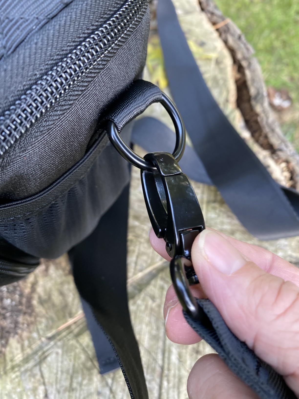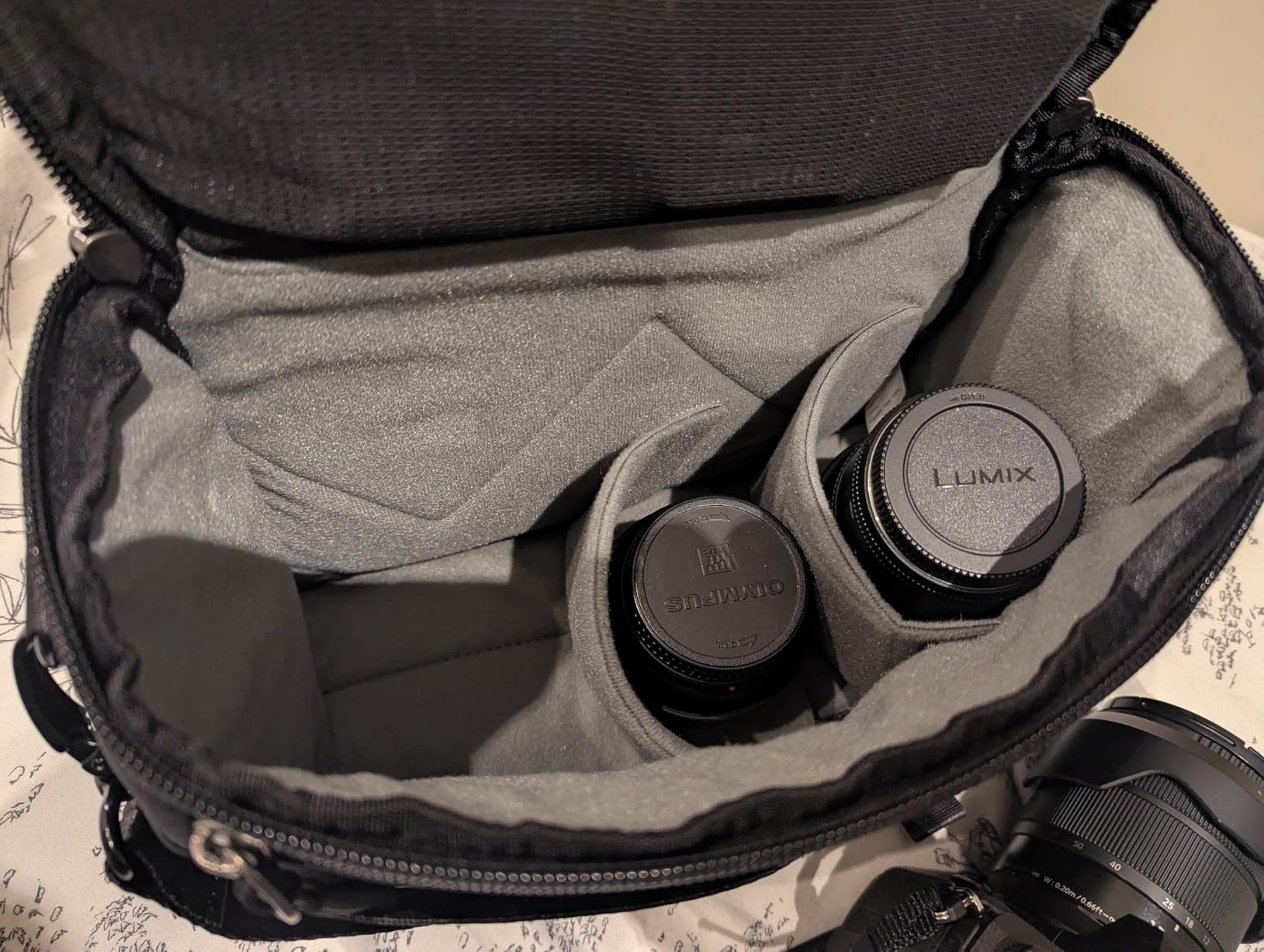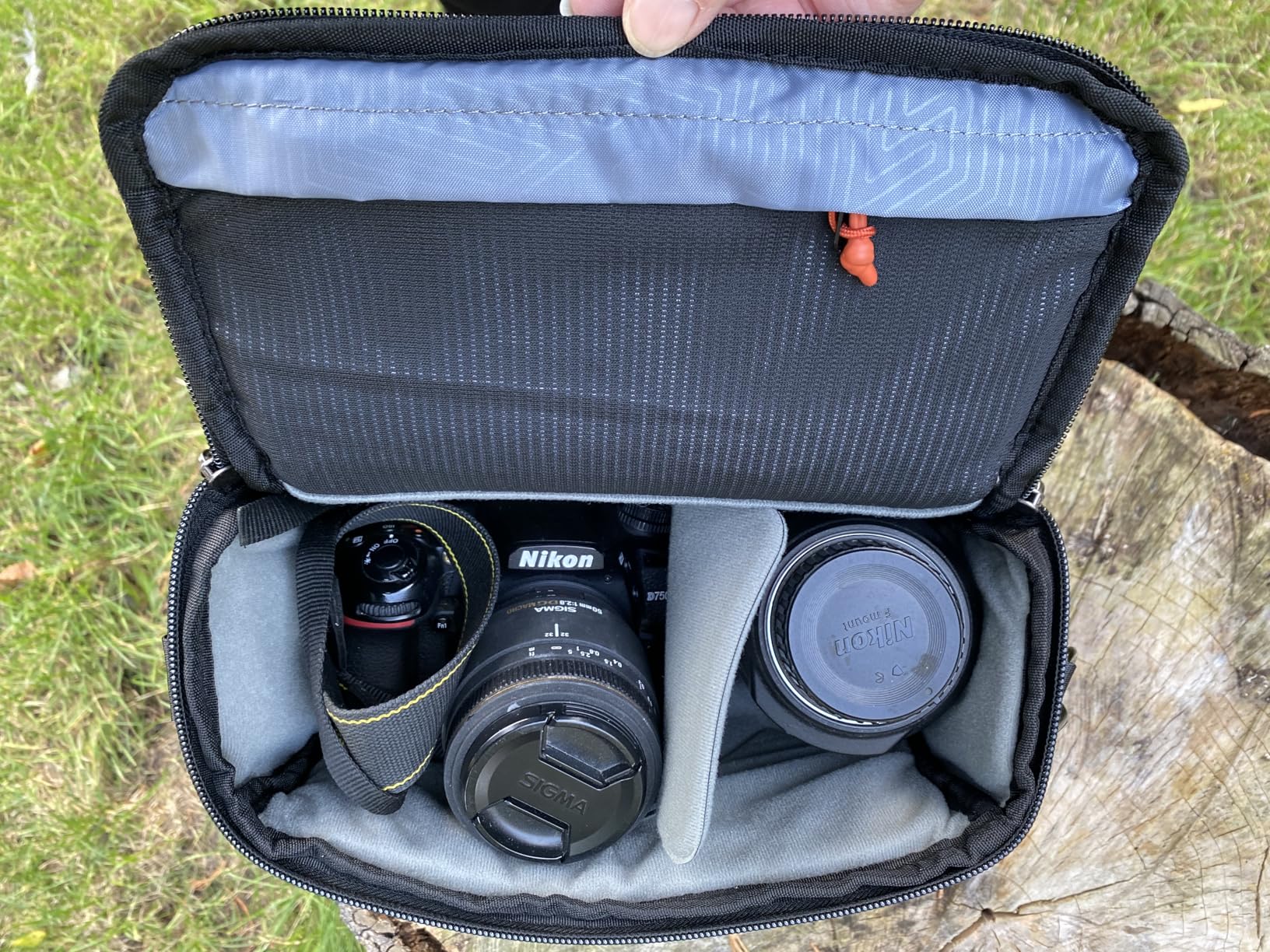 Una borsa molto elegante e compatta, perfetta per una reflex digitale e un paio di obiettivi. È adatta alla mia Nikon D7500 con un obiettivo macro da 50 mm montato e uno zoom 18-200 mm. Sono inclusi un paio di divisori che permettono di separare gli oggetti all'interno della borsa: si fissano all'interno tramite velcro. Ci sono diverse tasche e scomparti con cerniera sul corpo della borsa e, sul fondo, anche degli scomparti per trasportare un treppiede. È un ottimo zainetto per kit più piccoli: mi piace fotografare farfalle, funghi ecc., quindi questi sono i due obiettivi che cerco sempre di portare con me in viaggio: niente più fruscii in uno zaino che non è proprio adatto. Posso tenere a portata di mano il telefono e i soldi nella sezione frontale con cerniera, e ci posso mettere anche piccoli snack. La tracolla è in un tessuto comodo e resistente, fissata con clip metalliche di buona qualità, e la maniglia superiore la rende facile da afferrare e trasportare. Una borsa fantastica.